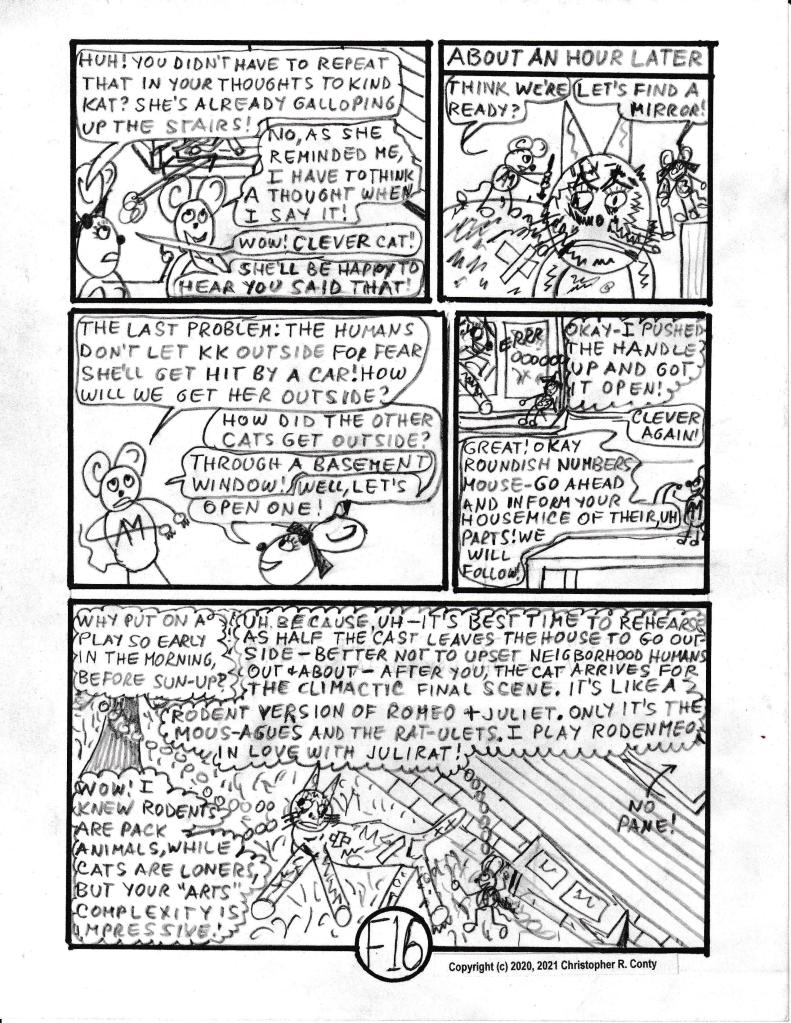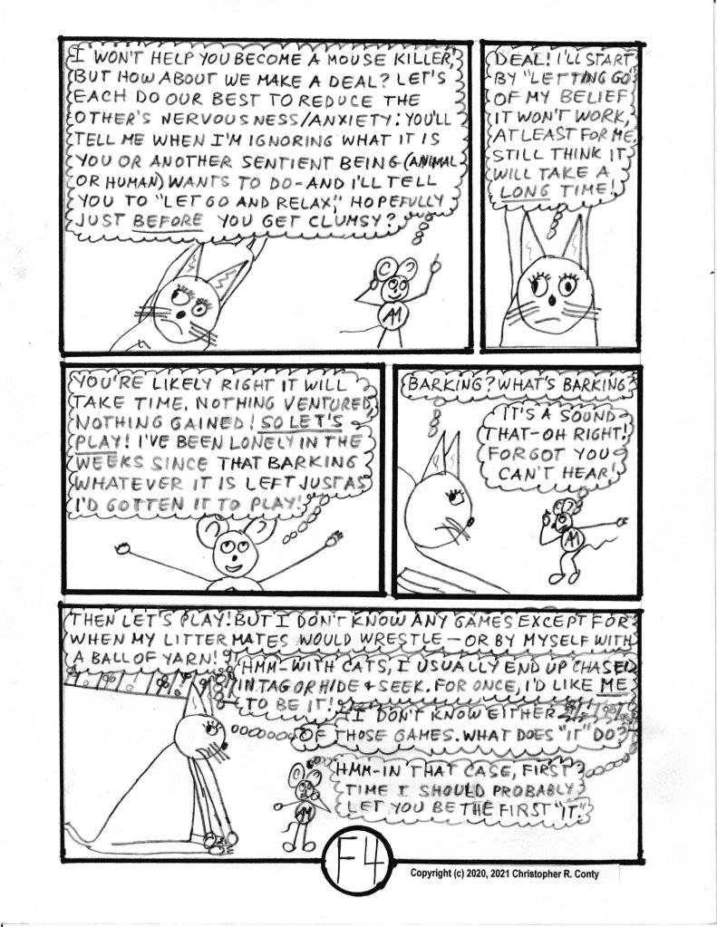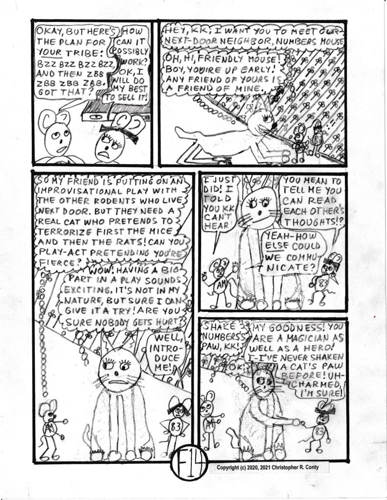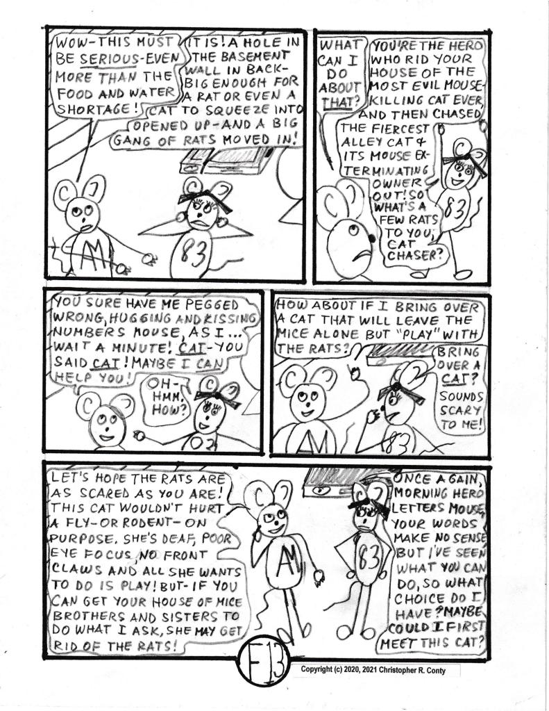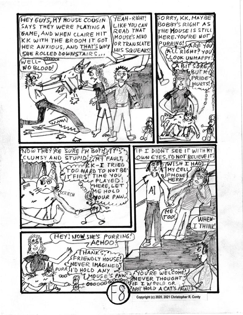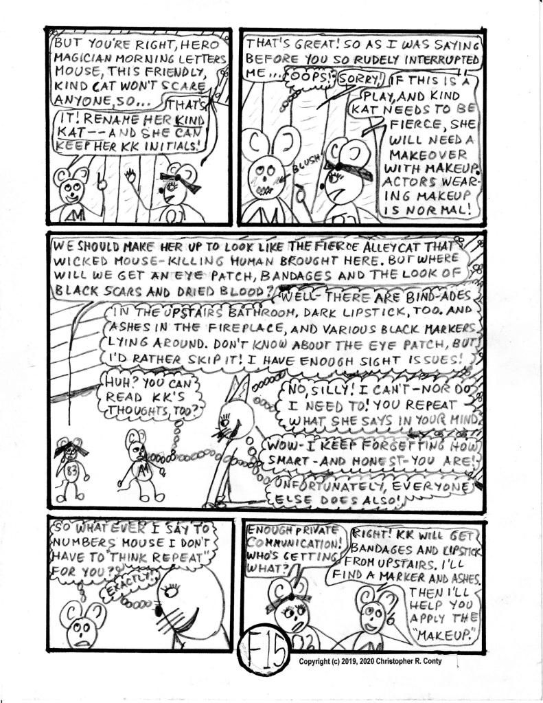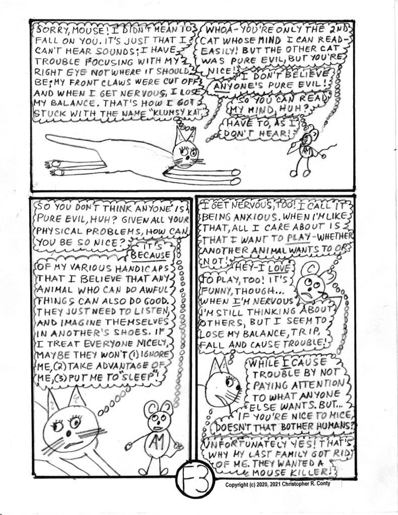 To bring back this character, Klumsy Kat — but make her more 3-dimensional and truly unique this time — KK (nickname used most often) is the only cat in this graphic novel who likes playing with AM in a non-aggressive way, instead of wanting to kill him. Besides changing from a “he” to a “she,” KK’s former “stupid look” of one eye up, one eye down (which is what Aspie Mouse’s predecessor Stupid Mouse also had) is replaced by having one “lazy eye” to help explain coordination issues; then she’s made deaf, as all-white cats almost always are (the original Klumsy Kat also was all-white). And this time her front paws were de-clawed — an all too-often procedure done to keep cats from scratching the furniture — usually with bad psychological and even physical problems resulting for the cat — and spayed (unable to have kittens). Finally, she also has Autism, which helps explain her “unexpected” behavior of not wanting to kill mice or birds, as well as her strong empathy for and affinity with Aspie Mouse. Klumsy Kat compensates for being deaf by being really good at communicating telepathically — via thoughts — with other beings receptive to reading her thoughts, which Aspie Mouse is (as he is with Brilli & Bobby, though not as strongly). Only in this respect is she like Brilli, the psychopathic cat in Chapter C in Volume I (who returns in Chapter G in this volume, interacting dramatically with KK). Note that Bobby and Aspie Mouse seem to communicate with each other much better when KK is present than they do when she’s not.