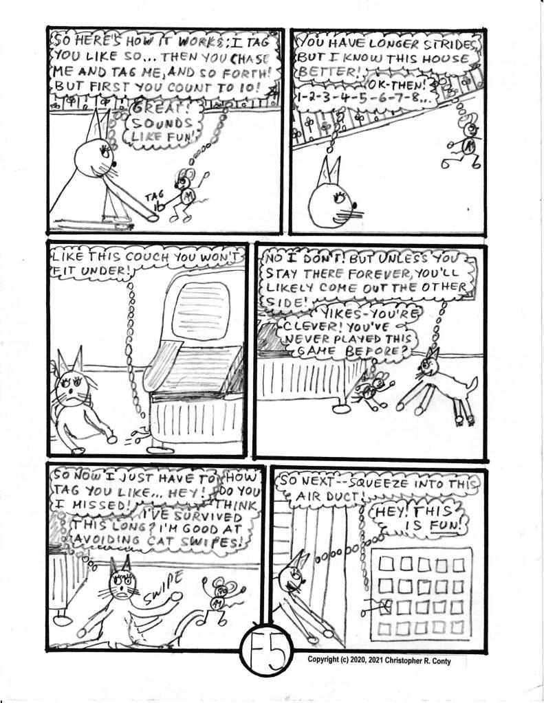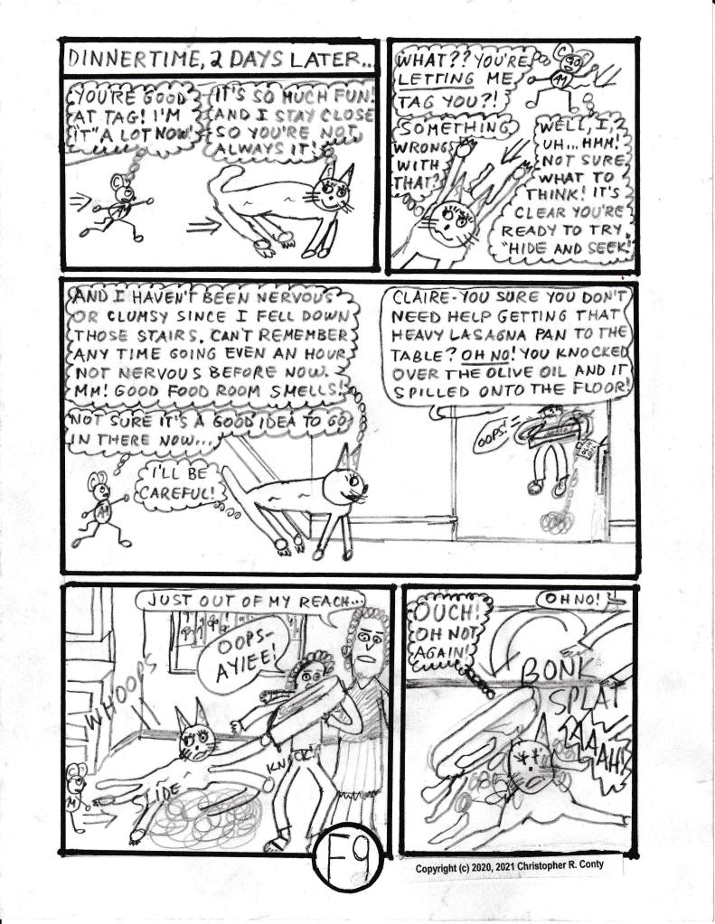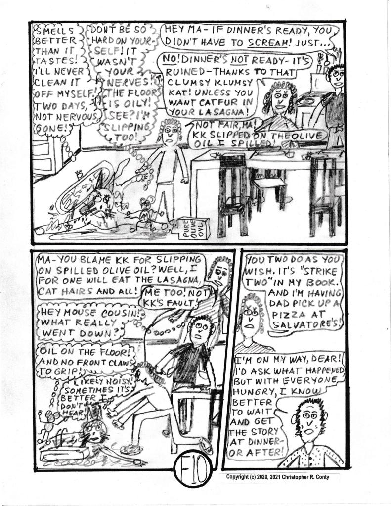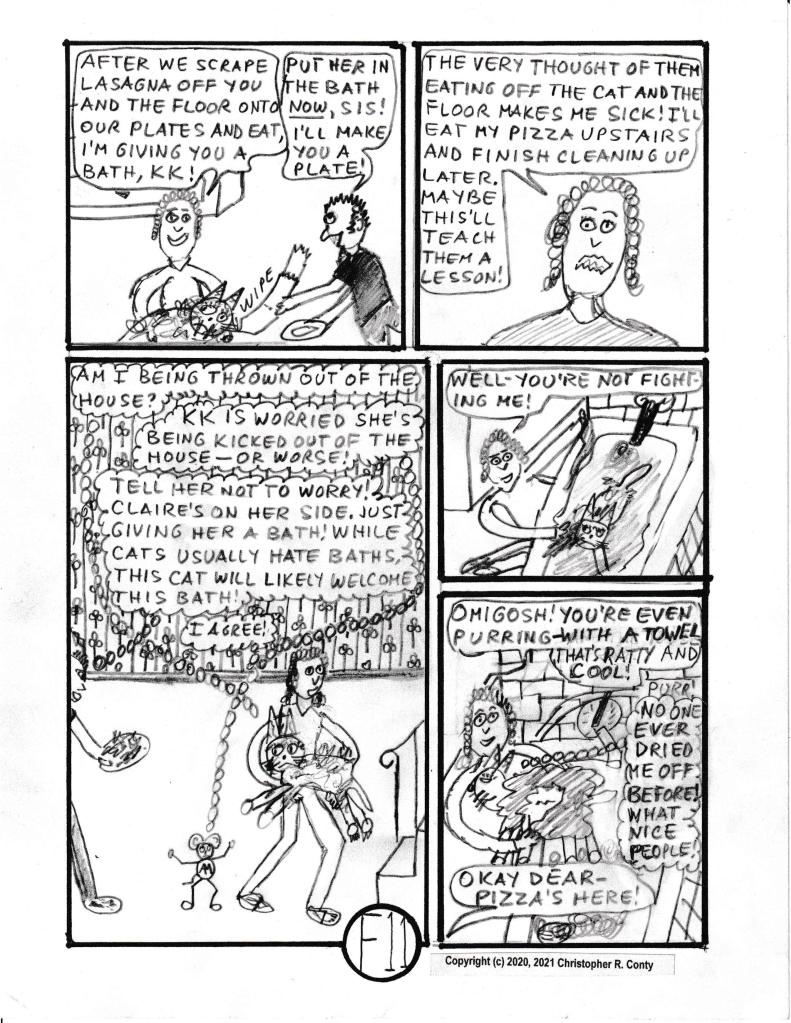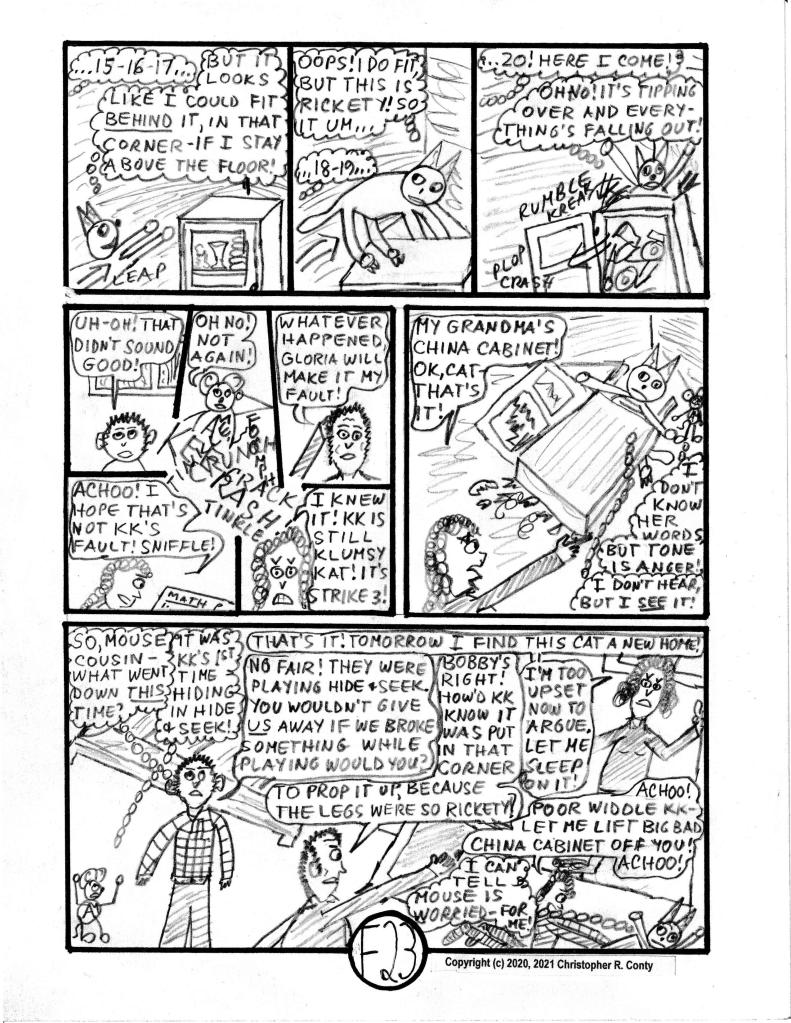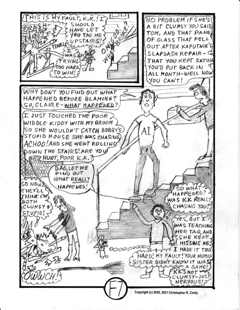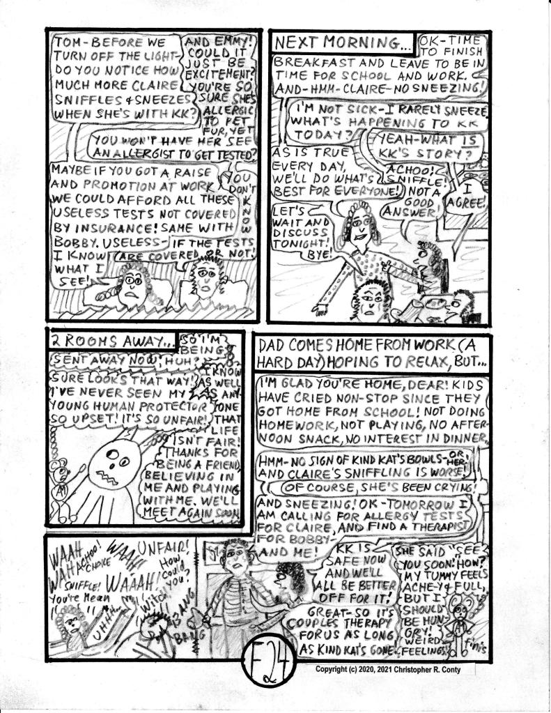 On the chapter’s last page — when the mom, Gloria Castelluzo, believes that Claire is allergic to cats — or at least to Klumsy Kat — she now believes she has a “good reason” (besides KK’s destructive behavior) to get rid of KK, much to the dismay of Aspie Mouse — and everyone else in the house! Thus the chapter ends sadly: KK is “sent away” by the mom while everyone else is at school or work. The real explanation for Claire’s sneezing is partially hinted at by Tom Castelluzo (the dad), but not finally revealed until the end of Chapter I by Aspie Mouse’s sister E-flat (originally “E” in Ch. B, Vol. I, reintroduced in Ch. G, 2nd chapter of Vol. II).