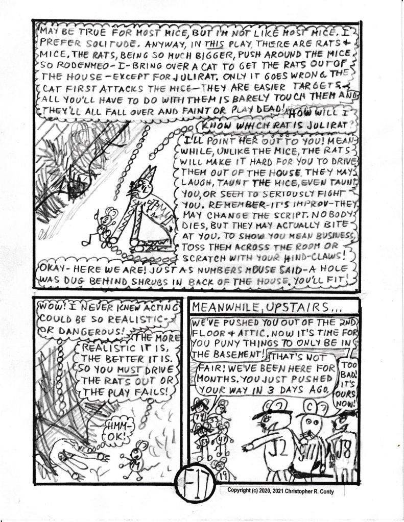 - #83 comes over to ask for AM’s help in ridding her house next door of rats that are trying to displace the mice; AM brings KK over and the rats decide they’ll find another house instead; this “scene” is the most complex in the chapter (complete with a “false improv play”), a sub-plot that runs 9+ pages.