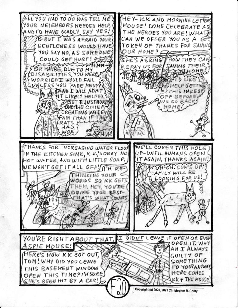 First 2 pages were posted in July, 2020; 6 more pages were posted 1/12/2021. When pages 9-20 (12 pp.) were posted (1/23/21), it was completed as of 1/28/2021. Only minor tweaks have been posted since. Now that Chapter F will become the first chapter of Volume II — given the decision to divide “Adventures” into two volumes with five action chapters each, that update will take a back seat to finishing Chapters Pre-A through E for initial publication. Then Ch. F will be the first chapter of Volume II to be upgraded. That will primarily mean adding “feelings/ thoughts” that differ from what the character says out loud, and by being more focused on the positive sides of 27 common Autistic traits. Neither of these is expected to change the chapter’s length, though that isn’t set in stone.
