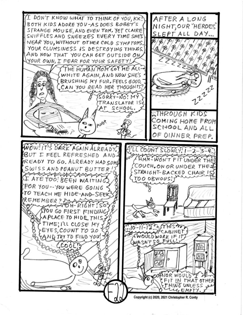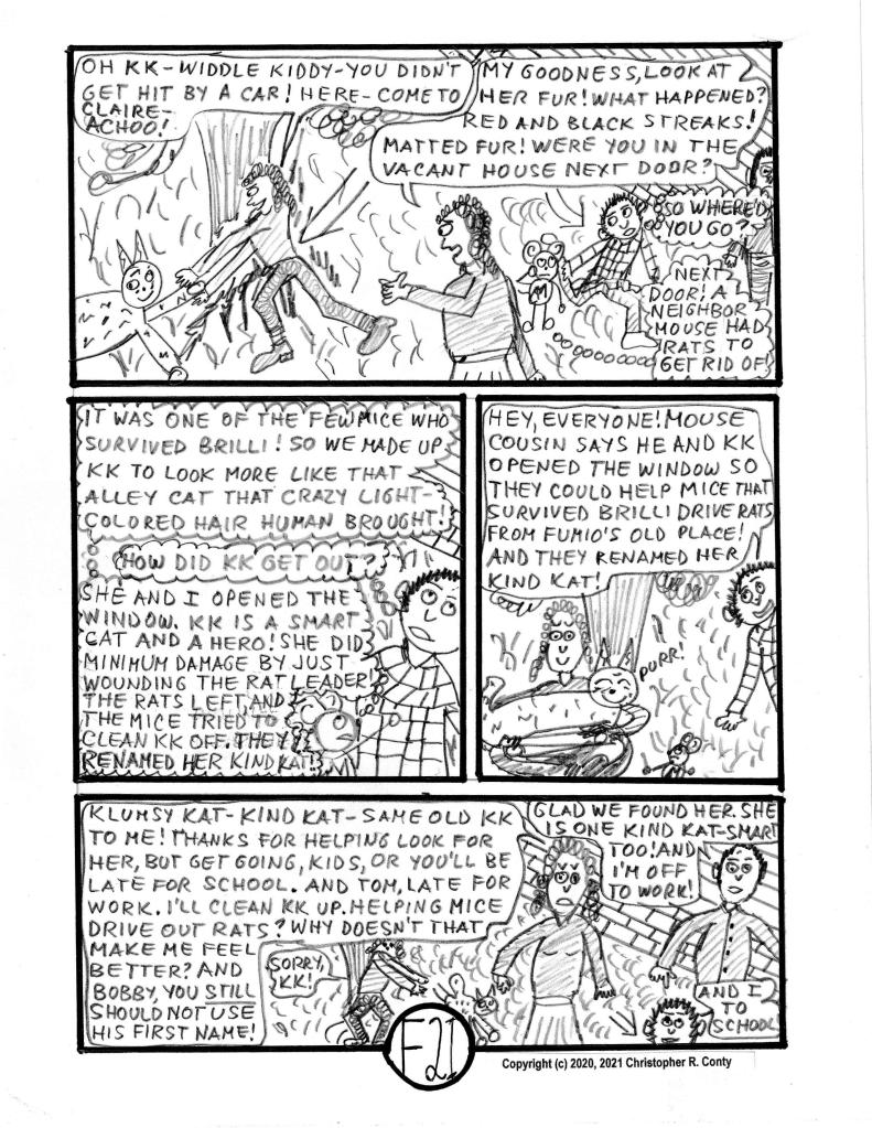 Originally conceived as a short chapter with no villain (like Chapter E, 16 pages), Ch. F ends up a more typical 24-page length, due to adding a 9-page sub-plot in which AM & KK become joint “heroes” by driving out rats who’ve invaded #83’s house (still “vacant” of humans since Mr. Nakamura moved out early in Chapter C). However, Claire Castelluzo’s apparent allergic reaction to KK, plus the damage caused by KK’s “play,” leads the mom to insist KK must go — much to everyone else’s dismay.