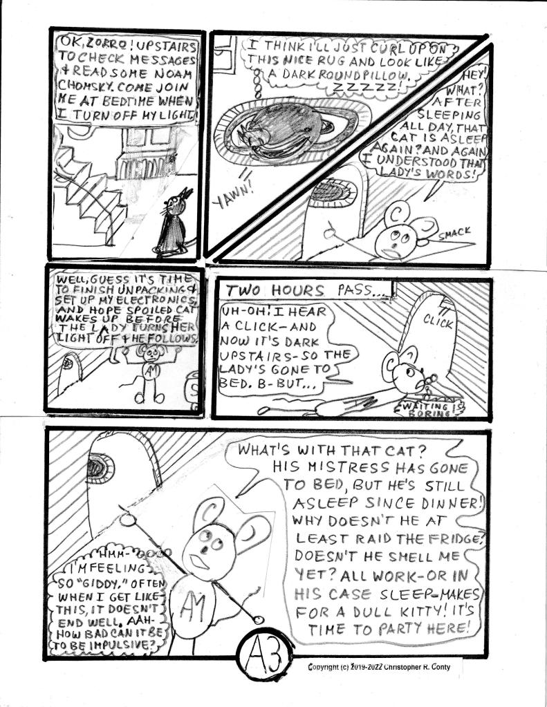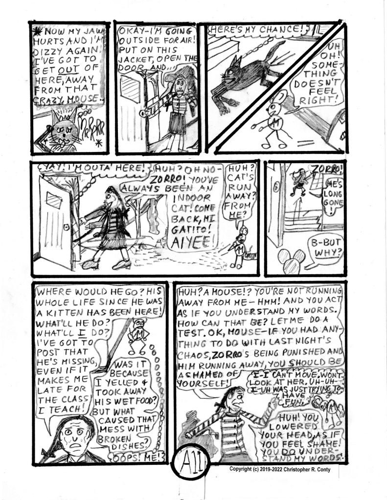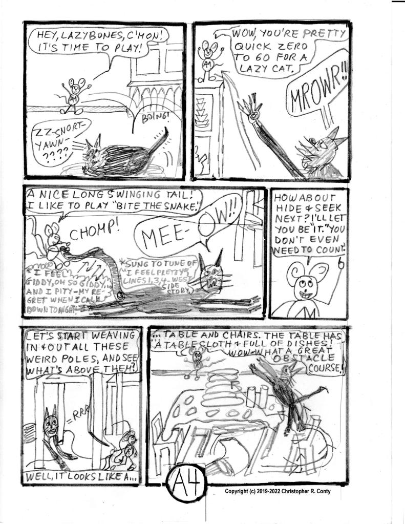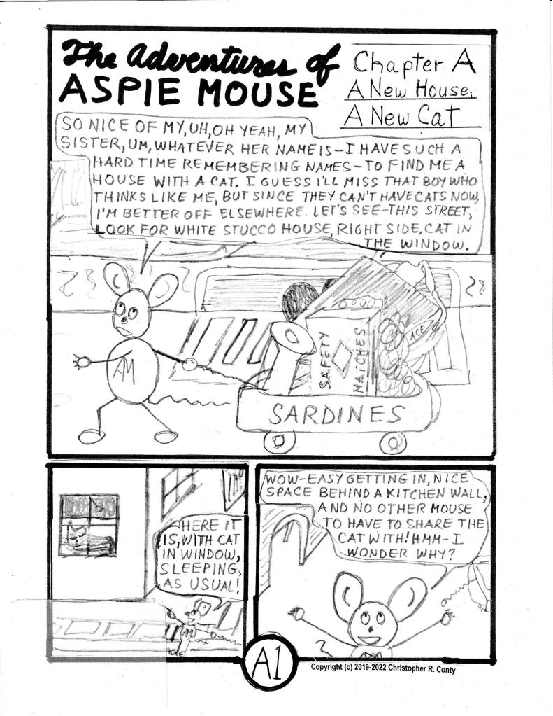 While first written, this chapter was originally intended to be a later chapter, originally Ch. J when I envisioned this graphic novel having 15 chapters averaging 15 pages each. As Chapters B, C & D were developed — each adding pages with every rewrite (while this first chapter was put aside) — and the average length of chapters increased to 25, I decided to limit the total number of chapters to 10, and re-letter Ch. J as Ch. H. Then — while Ch’s. E, F, G and I were being blocked out, a reviewer suggested that this put-aside first written chapter would make an ideal FIRST chapter, because it’s relatively straight-forward and has more action than words compared to other chapters: it’s primarily the story of Aspie Mouse trying to get a cat to “play” with him and the unintended consequences that follow. I agreed, but that required other changes.