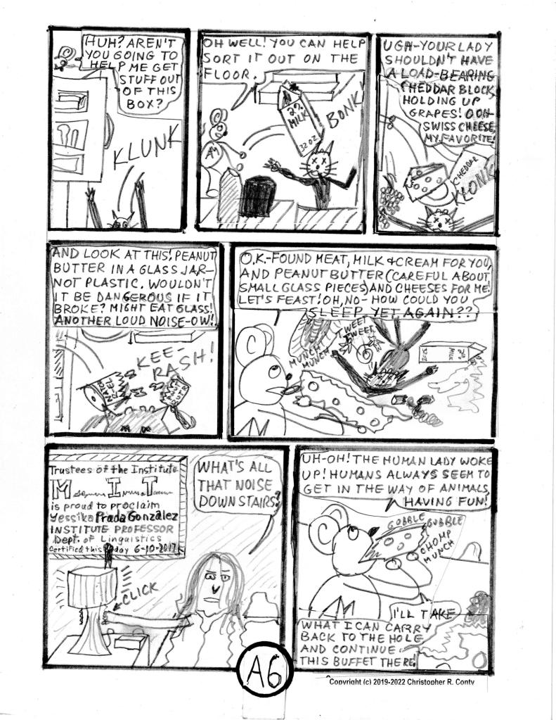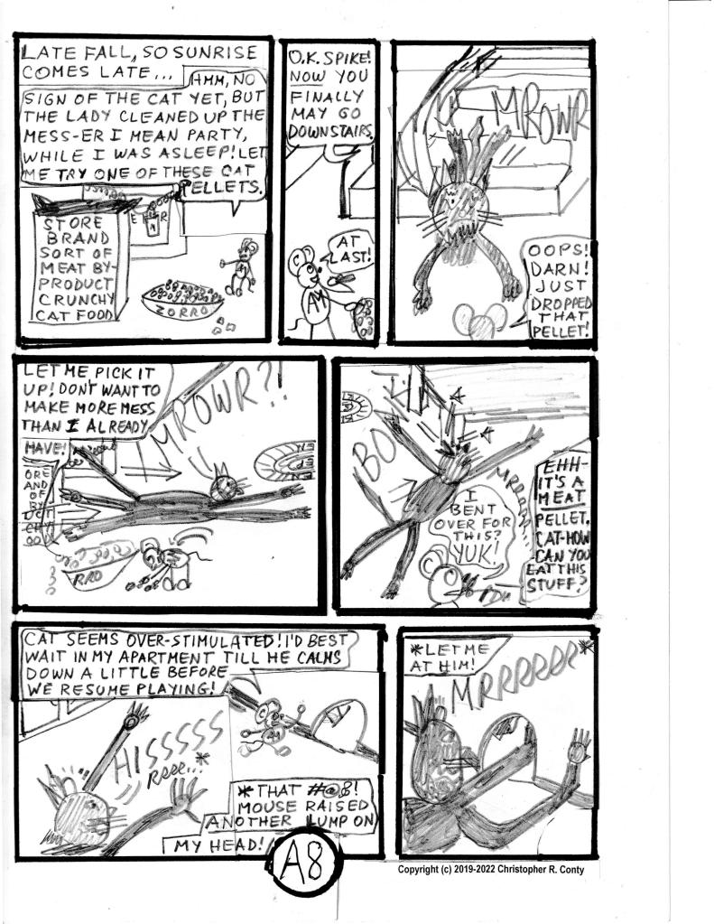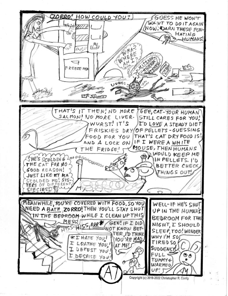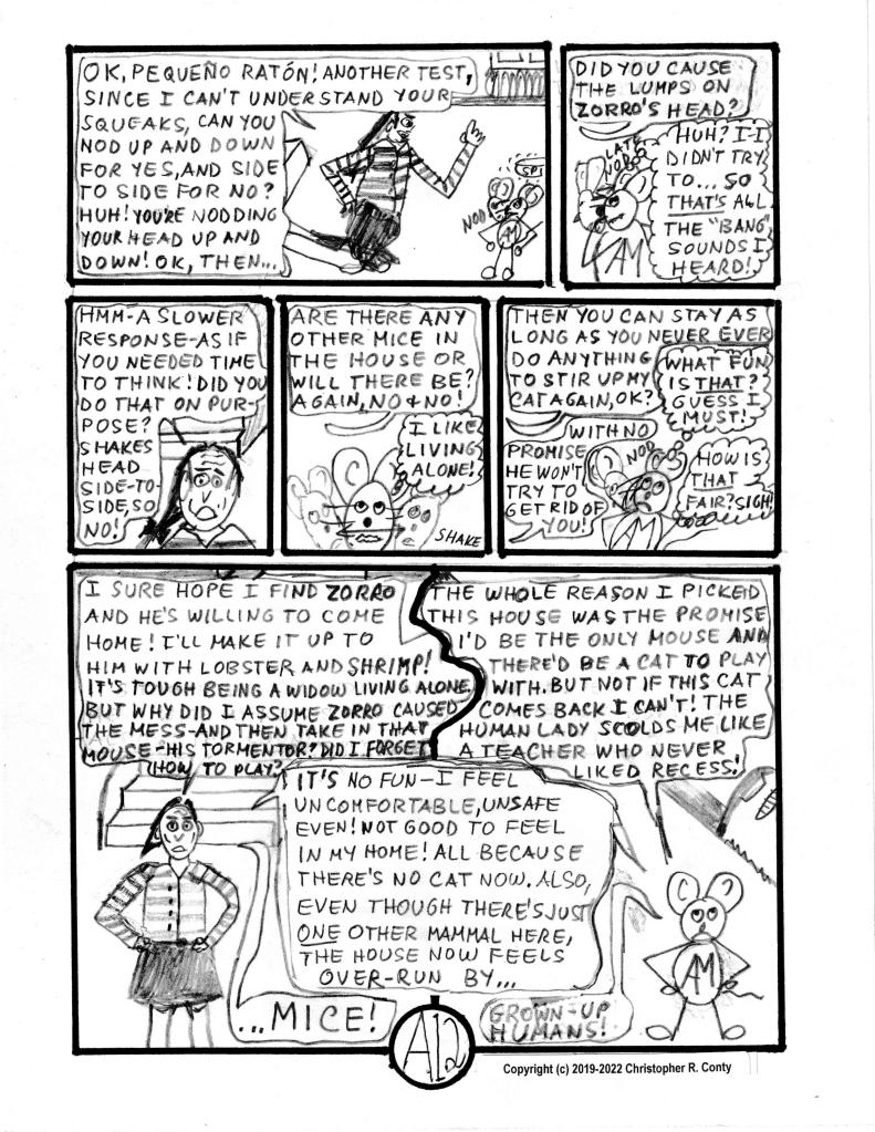 Chapter A is the first chapter I wrote after all those years of putting aside writing comic books. It’s an all-new chapter. But its plot — at least until the bottom of page 6 — is the same as if it had sprung from my Autism-fueled 12-14-year-old’s imagination. Aspie Mouse has a great time “playing” with Zorro the cat (The cat? Not so much!), in the process destroying the home’s kitchen — until the needs/ wants/ responsibilities of an adult (Neurotypical) human (Prof. Gonzalez) “ruin” it (from Aspie Mouse’s viewpoint).